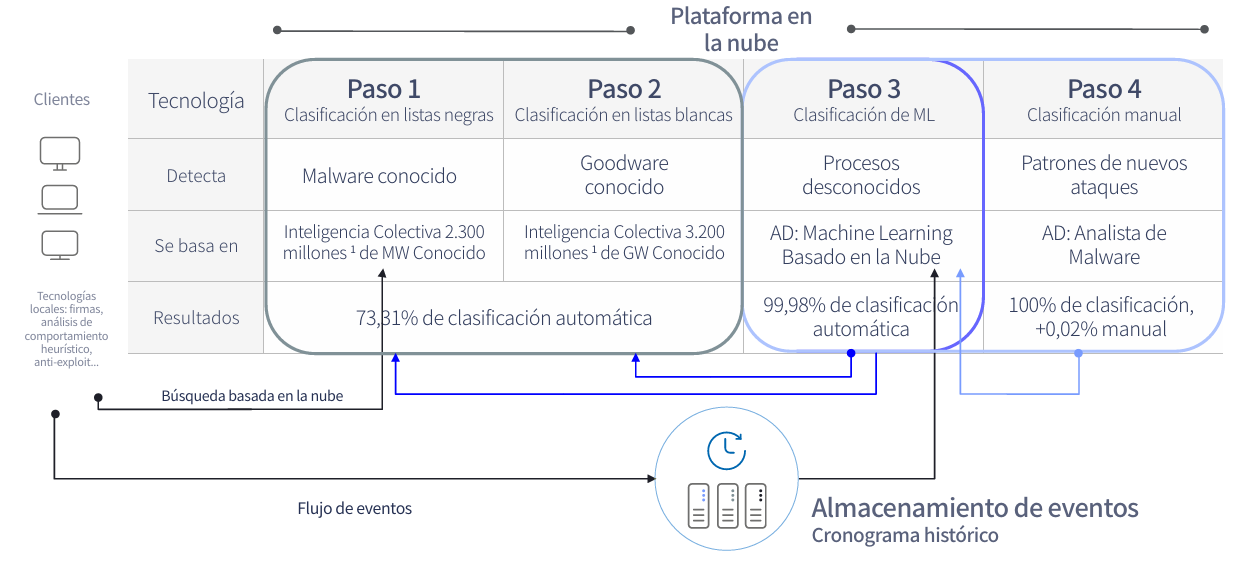 Se realizan clasificaciones automáticas en el sistema de IA basado en la nube, en el que se ejecuta una serie de varios algoritmos de machine learning (ML) que procesa cientos de atributos estáticos, de contexto y de comportamiento en tiempo real.